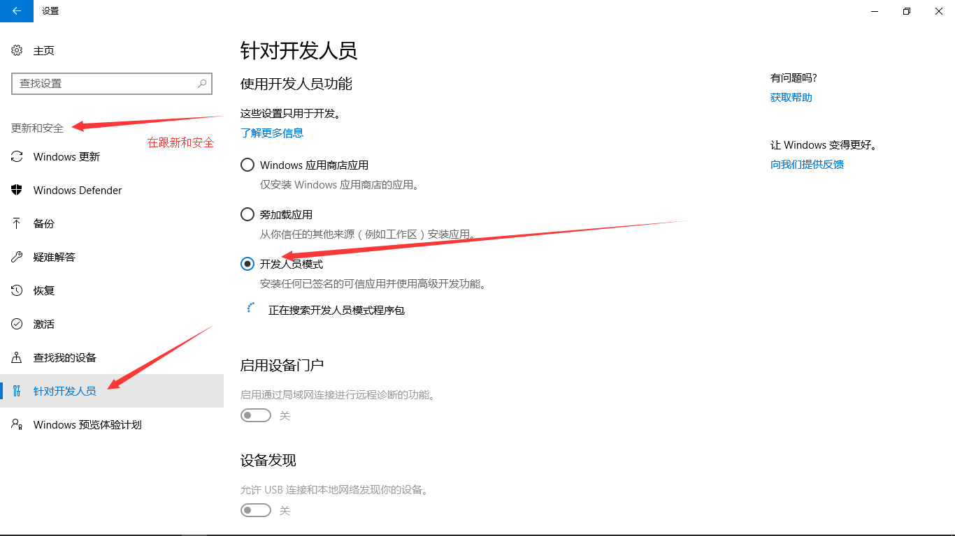 Then, open Settings -> Update & Security -> For Developers, select Developer mode -> Confirm to start it: