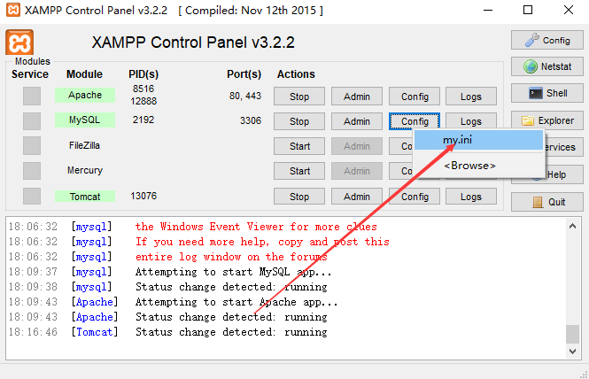 Open the XAMPP control panel and click the “Config” button next to MySQL to open the configuration file.