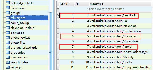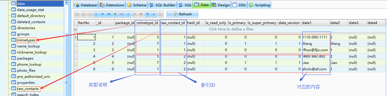 data1column almost contains all the data we need. The fourth column’s code indicates the type of data indata1. These codes are explained in themimetypestable. To find this data, we use theraw_contact_idto query, which comes from theraw_contactstable. -