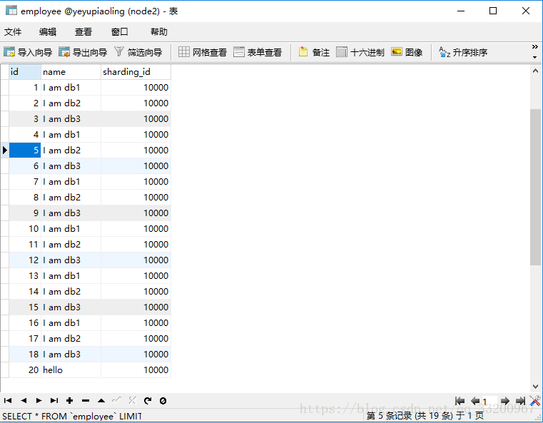 insert into employee(id,name,sharding_id) values(5, 'I am db2',10010);