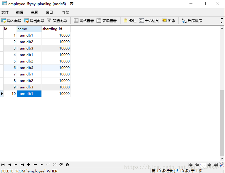 insert into employee(id,name,sharding_id) values(9, 'I am db3',10010);