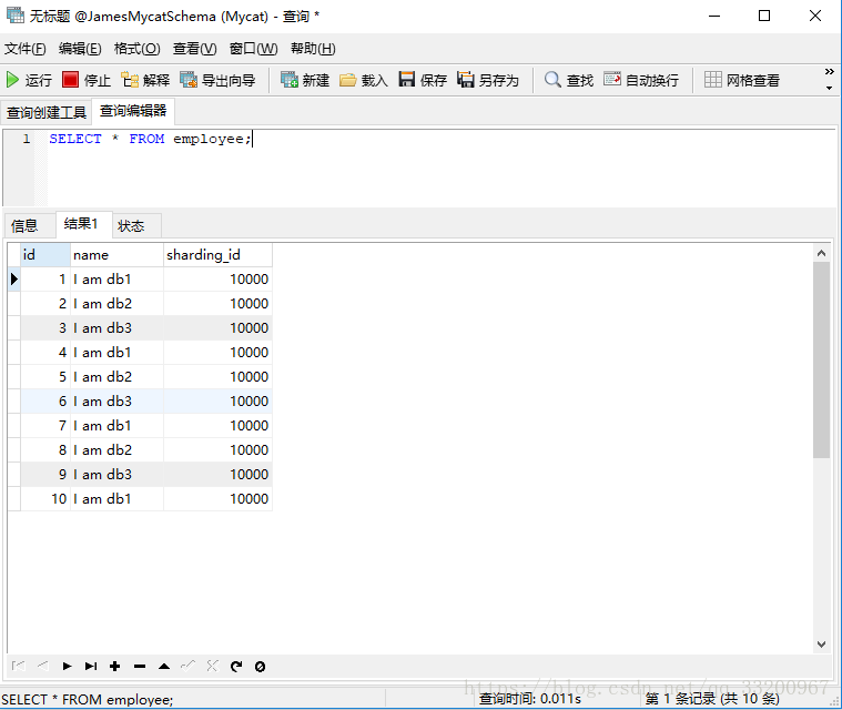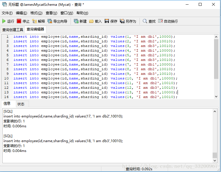 然后连接node1的Mycat,记得Mycat默认的端口是8066,账号和密码是server.xml中设置的。连接之后可以看到一个JamesMycatSchema数据库,这个就是我们在schema.xml配置的,可以看到有一张employee表,我们新建查询在这里插入一些数据: