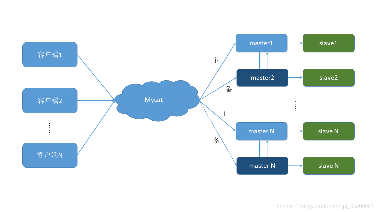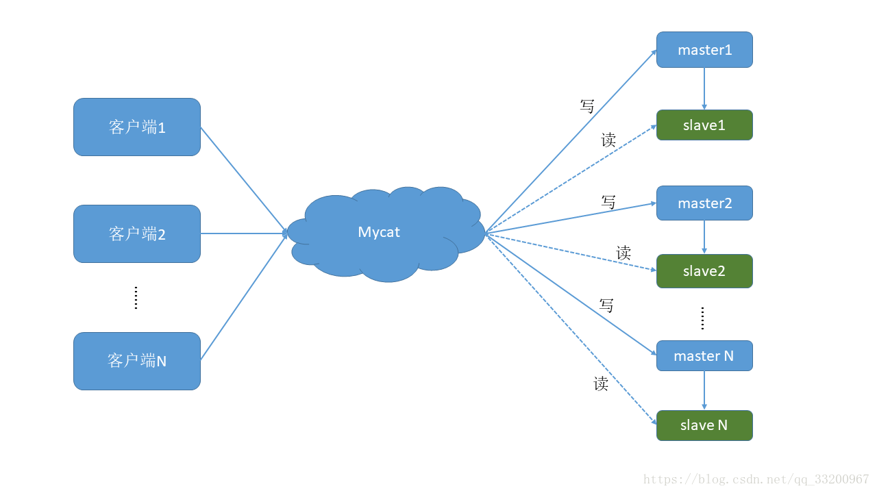 一主一从: 是一个主数据库一个从数据库,如果我们对主数据库进行写入操作,那么从数据库也会执行相应的操作。笔者把一主多从也归为这种方式,因为一主多从其实也就是增加多几个从数据库而已,具体的结构每个变动太大。在一主一从中,最大的好处是实现了读写分离,在Mycat的调度下,把所有写的操作都是在主数据库中,把所有的读的操作都放在从数据库中。可能有读者可能会有疑问,这中读取分离也可以使用后端代码实现,为什么要使用Mycat呢。主要是使用Mycat配置会更加简单,更容易维护,当数据库的位置发生了变化,如果是使用代码实现的,那么网站的后端代码要全部修改了,对于分布式的后端服务器来说,那工作量是非常大的。再且使用后端代码实现的读写分离也很难实现数据库的分布式。而使用Mycat都能解决这些问题。