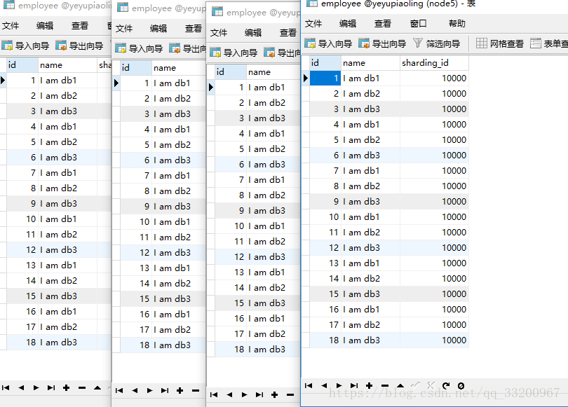 然后我们连接4个数据库,查看它们的数据,发现是跟预期的一样,每个数据库都插入了数据:
