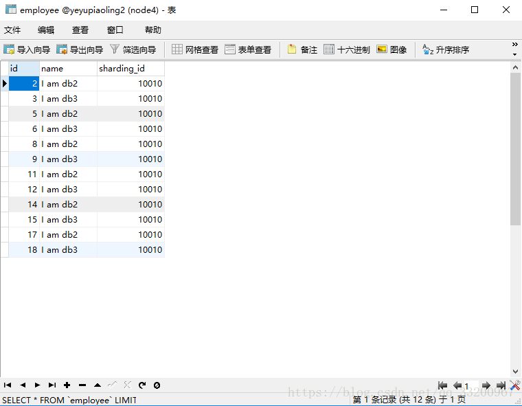 insert into employee(id,name,sharding_id) values(12, 'I am db3',10010);