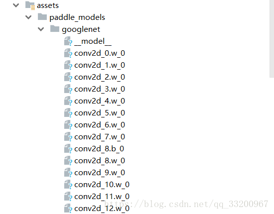 1、在main目录下创建l两个assets/paddle_models文件夹,这个文件夹我们将会使用它来存放PaddleFluid训练好的预测模型,官方也提供了一些训练好的模型和预测图像,可以在这里下载。预测有两种,一种是合并的模型,另一种是非合并的模型,在本项目中,我们使用的是非合并的模型,下面就是笔者使用的一个googlenet神经网络训练102中花卉数据集得到的预测模型,可以到这里下载笔者训练好的模型。