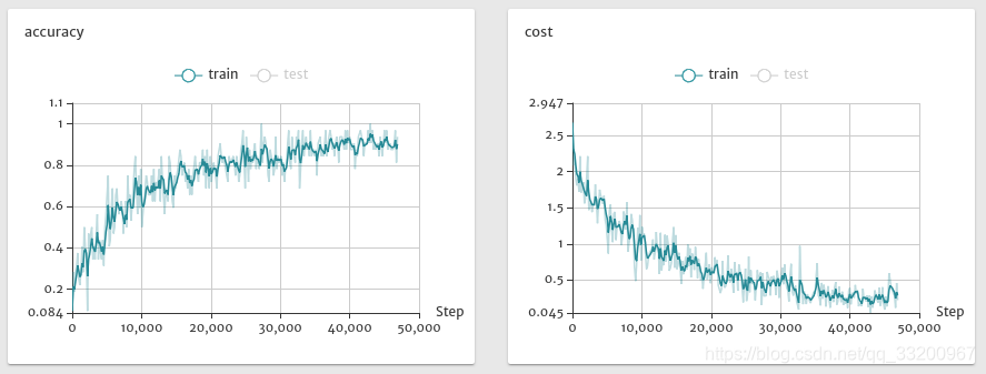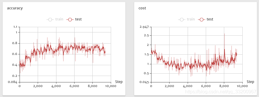 开始训练模型,在训练过程中,把训练时的损失值保存到train_cost_writer中,把训练时的准确率保存到train_acc_writer中,把训练过程中的参数变化保存到histogram中。把测试时的损失值保存到test_cost_writer中,把测试时的准确率保存到test_acc_writer中。