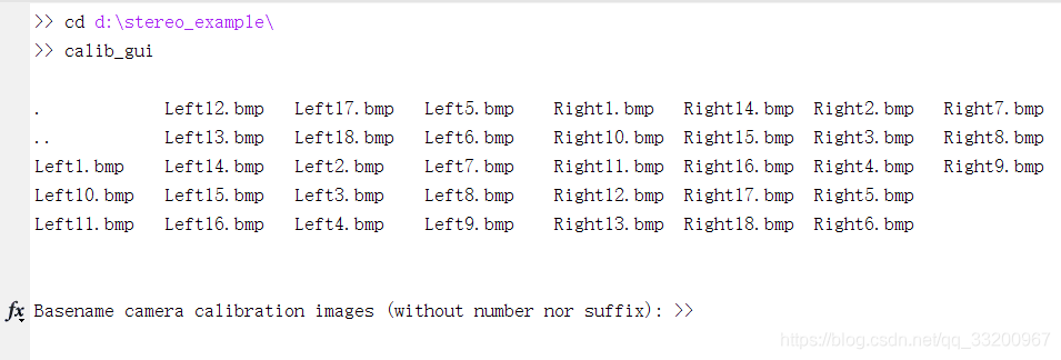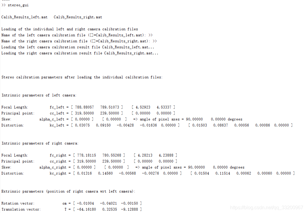 上面都完成之后,应该有Calib_Results_left.mat和Calib_Results_right.mat这两个文件。然后在命令区输入命令:stereo_gui,会弹出以下界面,点击Load left and right calibration files按钮。