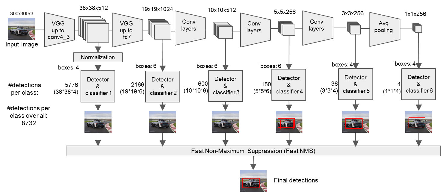 3. Has a simple model structure: SSD places all computations in one network, generally divided into two parts: an image feature extraction network and a classification/detection network.
