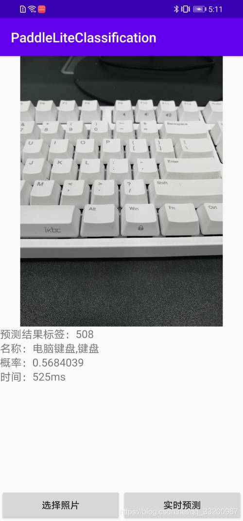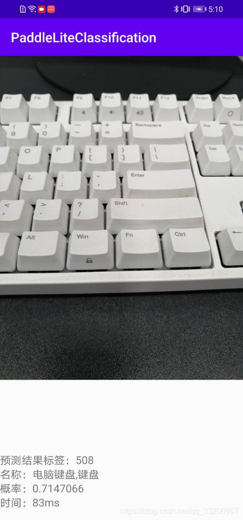 当打开相册选择照片之后,回到原来的页面,在下面这个回调方法中获取选择图片的Uri,通过Uri可以获取到图片的绝对路径。如果Android8以上的设备获取不到图片,需要在AndroidManifest.xml配置文件中的application添加android:requestLegacyExternalStorage="true"。拿到图片路径之后,调用PaddleLiteClassification类中的predictImage()方法预测并获取预测值,在页面上显示预测的标签、对应标签的名称、概率值和预测时间。