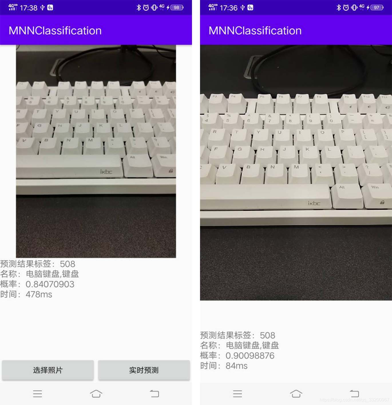 Add click events for the two buttons to either open the album to read images for prediction or open another Activity to call the camera for real-time recognition: