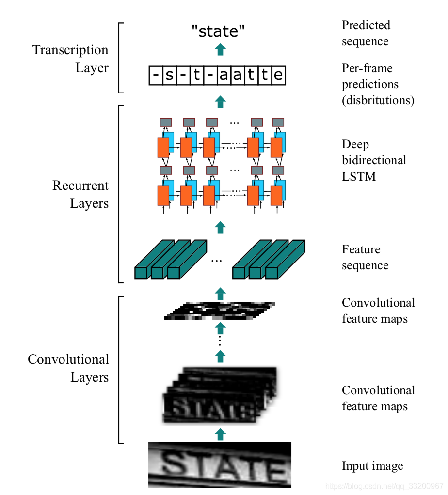 The structure of CRNN is as follows: An image with a height of 32 and arbitrary width. After passing through multiple convolutional layers, the height becomes 1. After paddle.squeeze(), the height is removed. That is, the input image BCHW becomes BCW after convolution. Then the feature order is changed from BCW to WBC and input into the RNN. After two RNN layers, the final input of the model is (W, B, Class_num), which is exactly the input of the CTCLoss function.