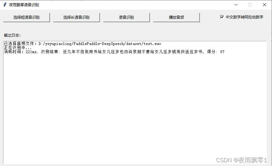 我們可以使用這個腳本使用模型進行預測,如果如何還沒導出模型,需要執行導出模型操作把模型參數導出爲預測模型,通過傳遞音頻文件的路徑進行識別,通過參數--wav_path指定需要預測的音頻路徑。支持中文數字轉阿拉伯數字,將參數--to_an設置爲True即可,默認爲True。