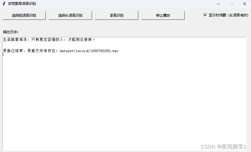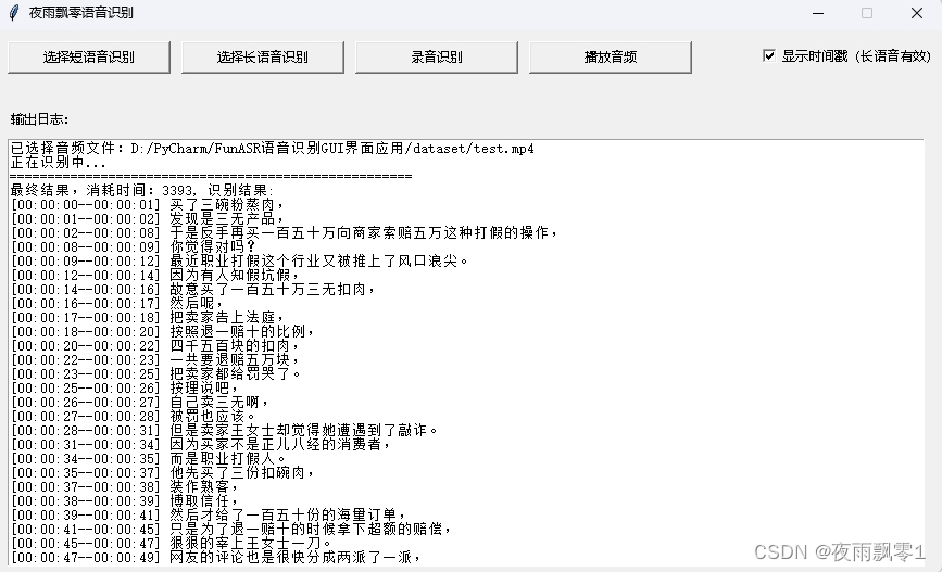 Long audio recognition (with timestamps): The second one displays timestamps, allowing you to know the start and end times of each sentence, which can be used for subtitle creation.