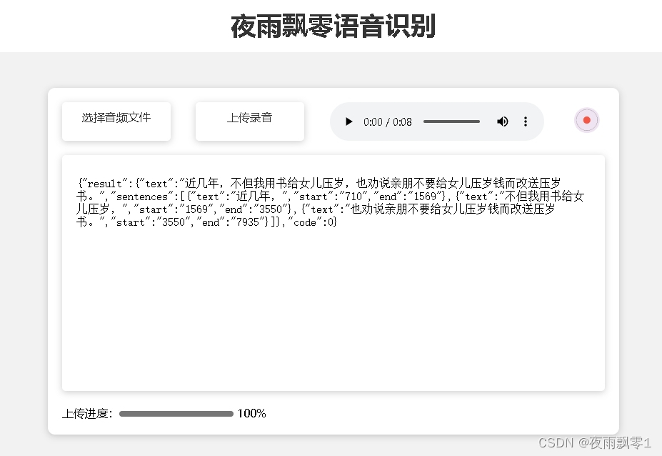Visit http://192.168.0.100:6060 to open the page. You can upload WAV, MP3, MP4, etc., and it also supports recording for recognition. The returned result includes timestamps for each sentence: